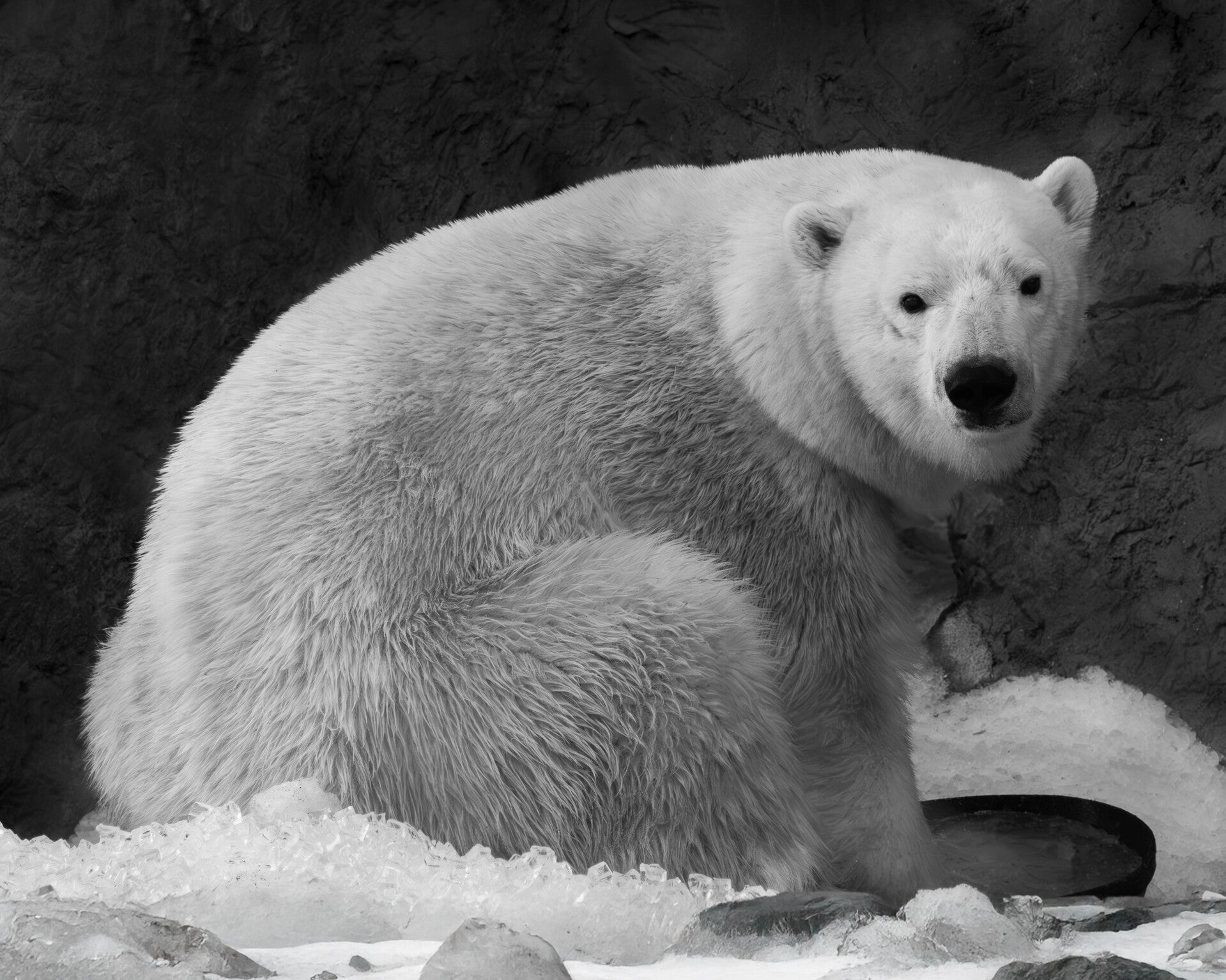 Confront the raw power of the Arctic with a commanding black and white portrait capturing a polar bear’s direct gaze, locked straight into the lens. Every detail of its thick fur and weathered face is rendered with striking clarity, set against a stark backdrop of ice and stone. The monochrome palette amplifies the mood—resolute, timeless, and unflinching. This image doesn’t just show a bear; it presents a presence.